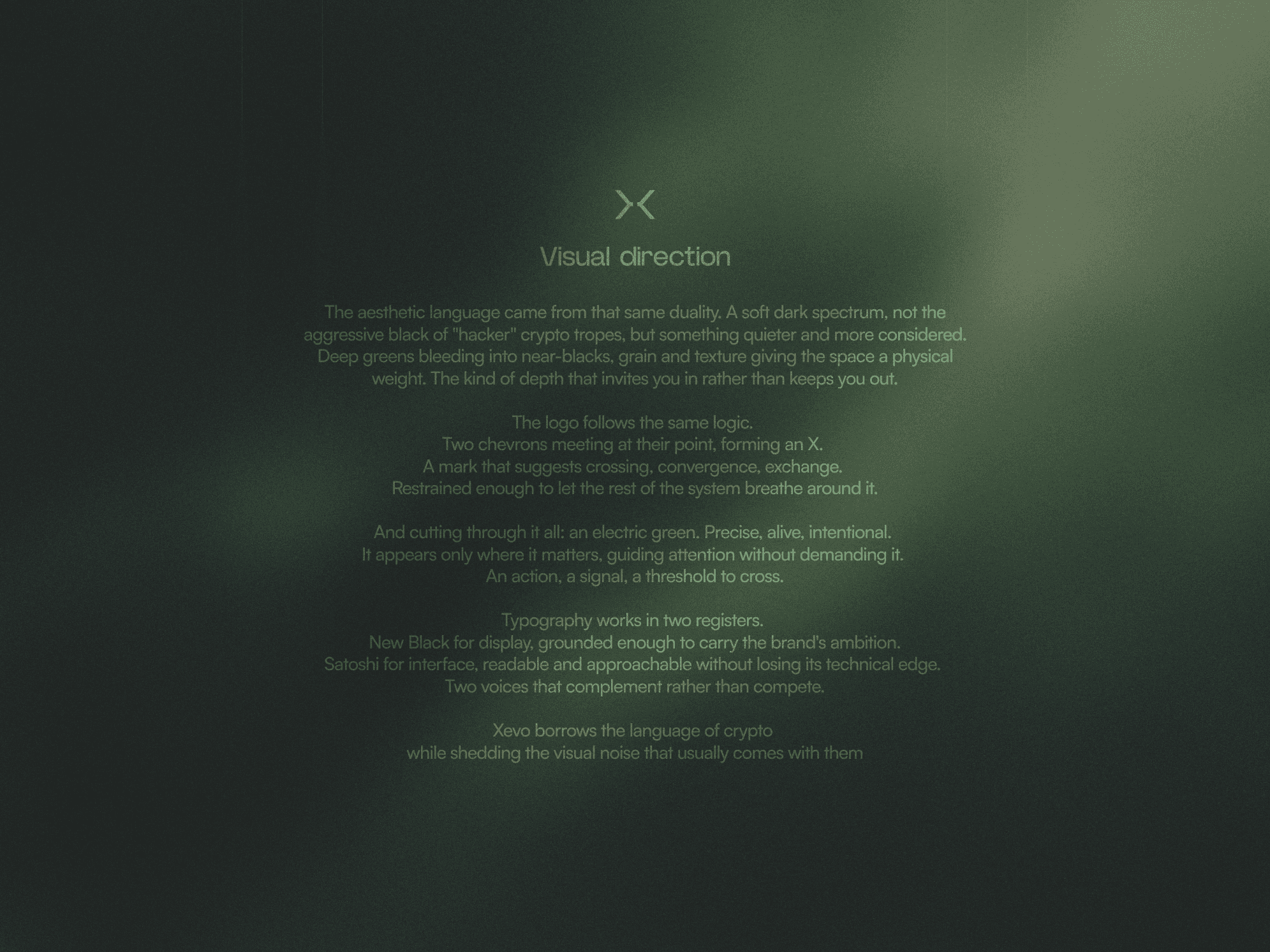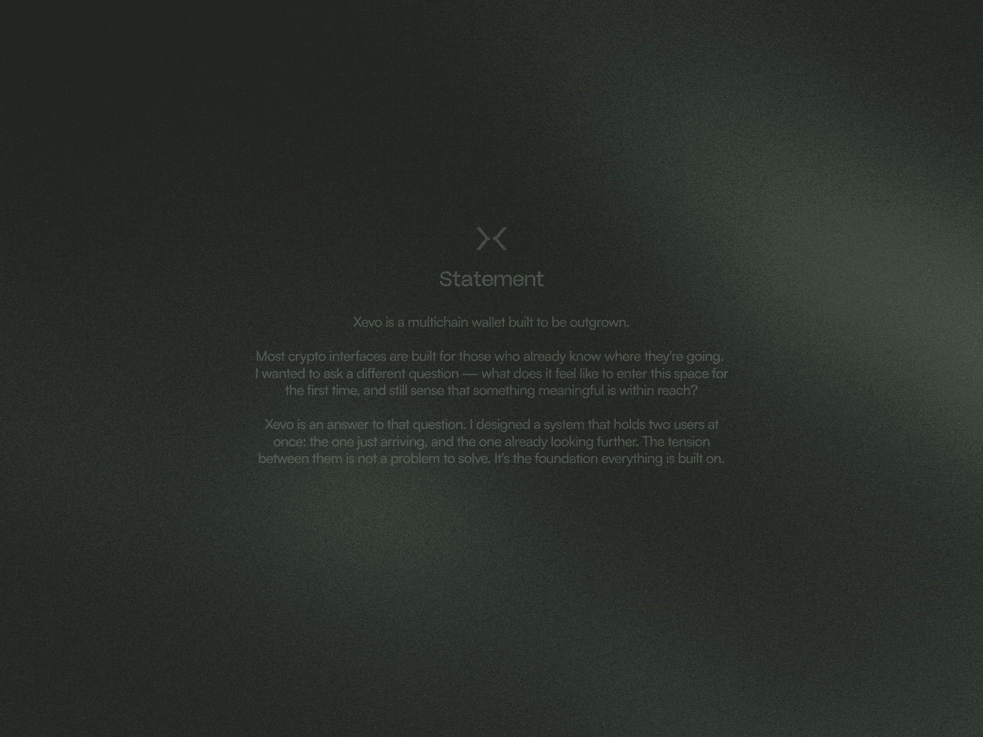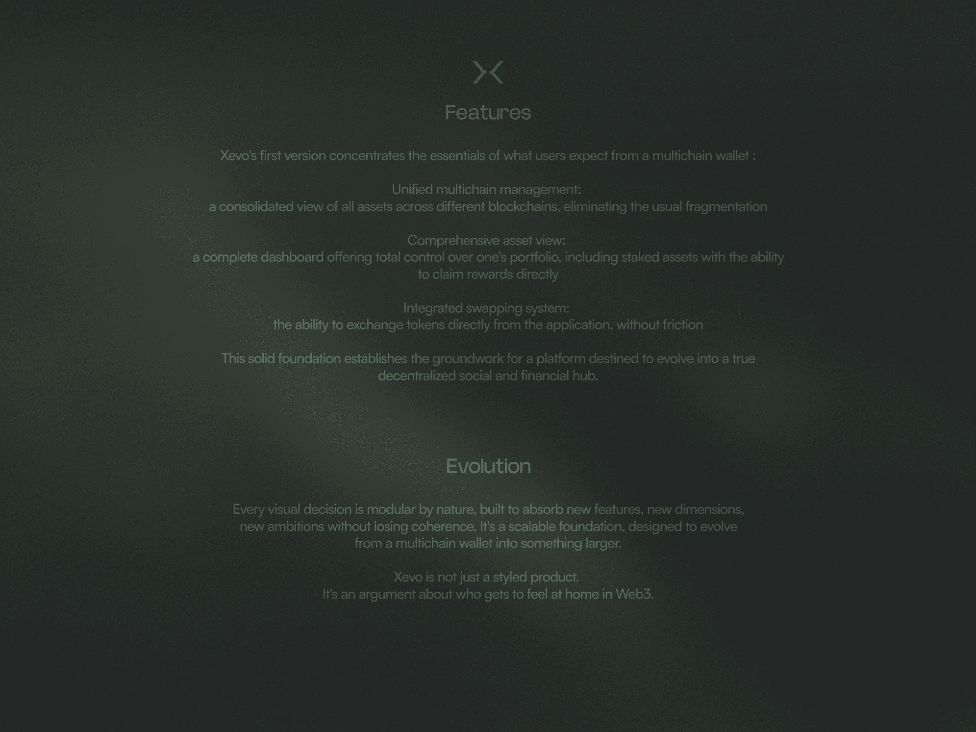 Most crypto interfaces speak to those who already belong. I designed Xevo for everyone else, and for who they're becoming. A visual identity and UX system that balances intuitive minimalism with crypto-native depth: a soft dark spectrum, an electric green that cuts through, and an architecture built to scale from multichain wallet to decentralized social and financial hub.